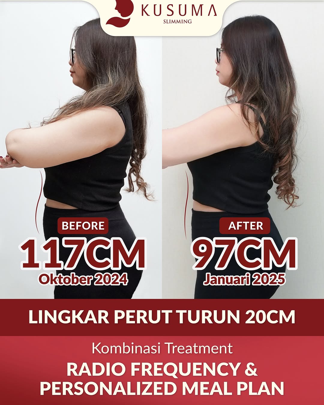 Gak nyangka hasilnya secepat ini! Dalam 3 bulan, lingkar perut mengecil & tubuh lebih kencang tanpa diet ekstrem. Thank you Kusuma Beauty!